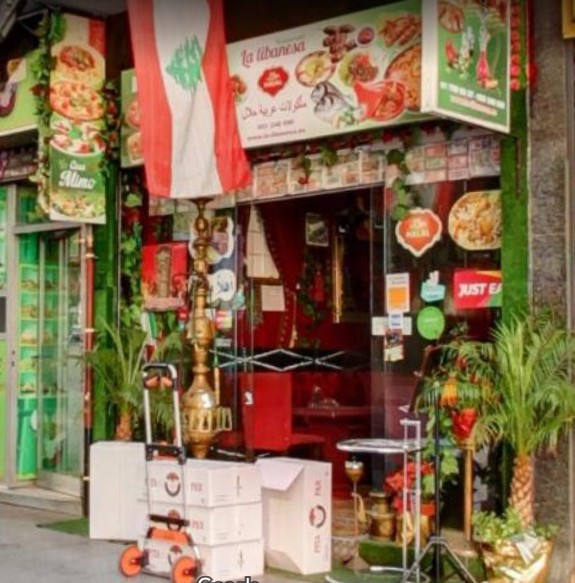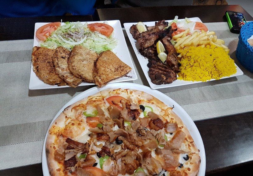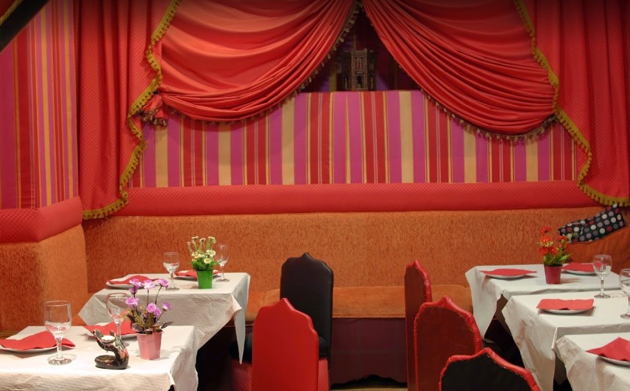 Platos típicos libaneses como tajín o taboule  en comedor de aire oriental decorado en tonos rojos.